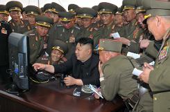 A picture released by North Korea's official Korean Central News Agency (KCNA) on April 27, 2014 shows leader Kim Jong-Un (C) looking at a computer at a military base