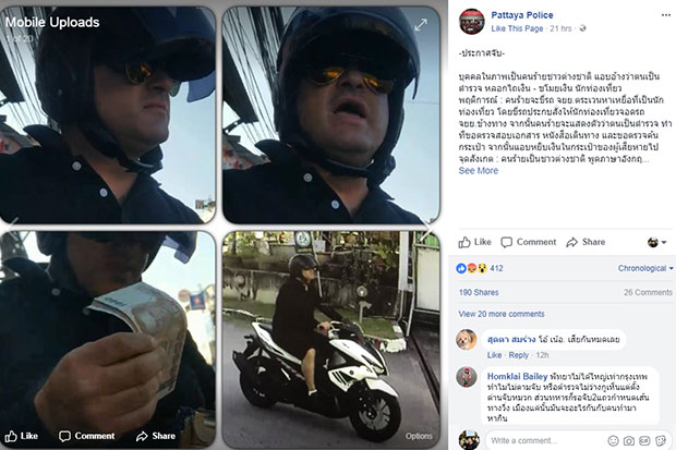 According to the Facebook page, the suspect rode a motorcycle with no licence plates to look for victims, mostly Chinese nationals, walking along streets in this beach city. After picking his target, he would pretend to be a police officer, asking to see the victim's passport and search the victim’s bag or wallet. During the search, the suspect would then steal money. The offences were alleged to take place in Na Jomthien area of Pattaya.