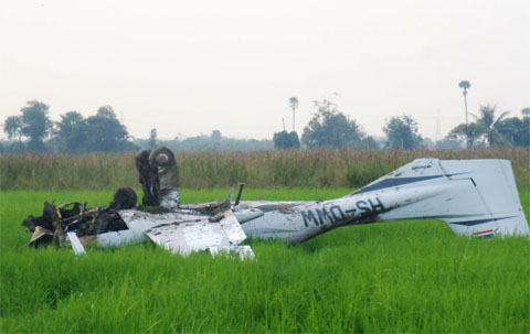 A two-seater Cessna DA42 plane rests upside down after crashing in a paddy field in Sam Khok district of Pathum Thani province yesterday afternoon. (Photo by Pongpat Wongyala)