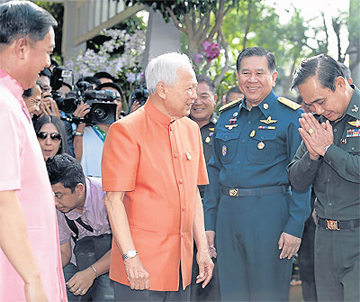 Earlier yesterday, Gen Thanasak Patimaprakorn, the supreme commander, led Gen Prayuth Chan-ocha, the national army chief, ACM Prajin Jantong, the air force chief, Adm Surasak Roonroengrom, the navy chief, Pol Gen Adul Saengsingkaew, the police chief, and Pol Lt-Gen Kamronwit Thoopkrachang, the metropolitan police chief, to call on ACM Sukumpol to offer their New Year's blessings.