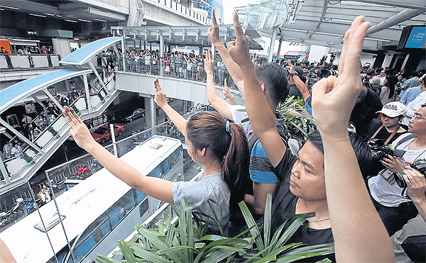 Anti-coup protesters hold up three fingers as a protest symbol during their rally outside Terminal 21 shopping centre yesterday. WEERAWONG WONGPREEDEE