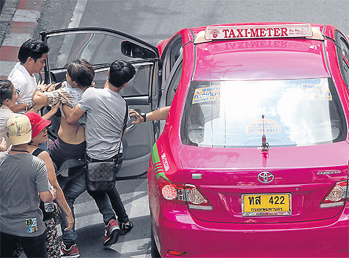 Plain-clothes police arrest a protester near Terminal 21 shopping centre and put her in a car as they head to a local police station yesterday. THITI WANNAMONTHA
